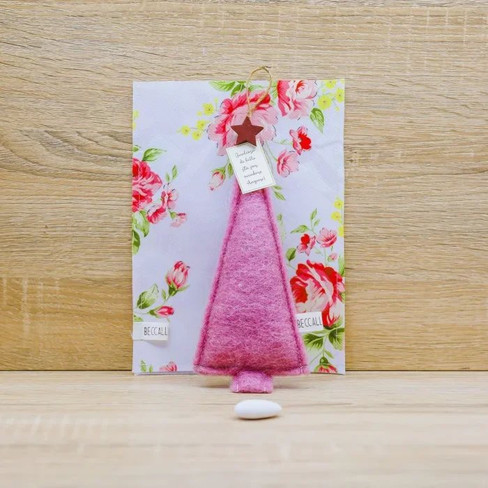 Albero Natalizio Fucsia con Sali profumati, stella in legno posta in cima dell’albero e frase: “Qualcosa di bello sta per accadere. Auguri!!”, firmato Beccalli for Life.