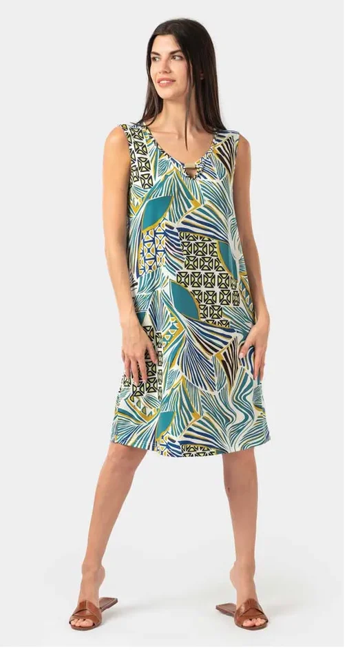 Abito donna corto morbido e leggero, con scollo a v e spalla larga molto colorato adatto per diverse occasioni.