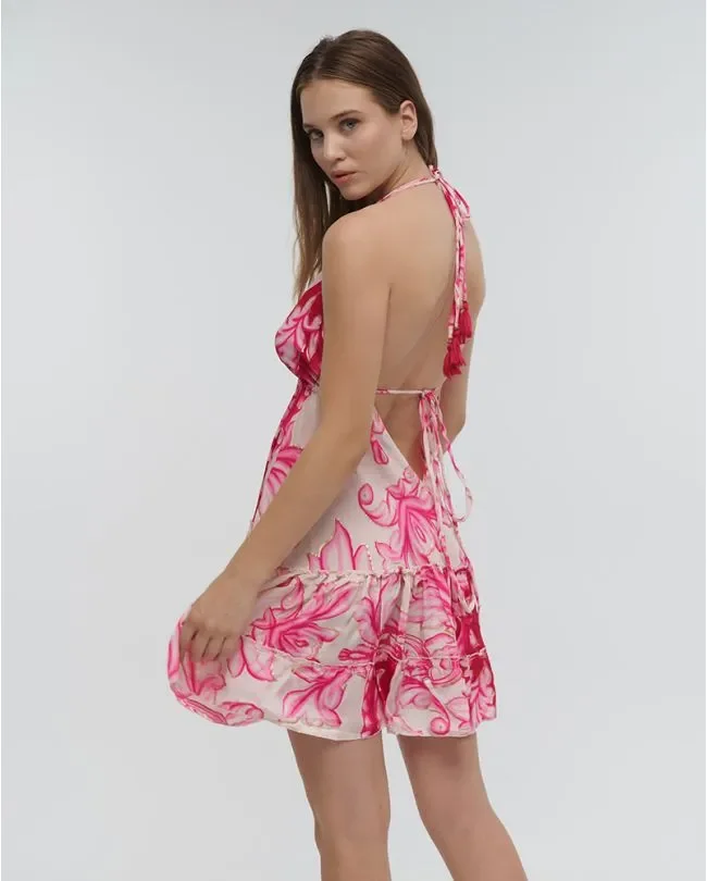 Abito corto da donna morbido e leggero con fantasia che racchiude rosa bianco e dettegli oro, con allacciatura regolabile al collo e scollatura sulla schiena.