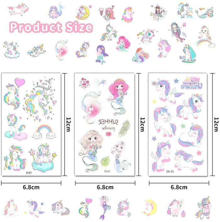 ❤ [Adesivi per tatuaggi con più di 350 motivi diversi]: Contiene 20 set di motivi a unicorno e 10 set di motivi a sirena: i tatuaggi temporanei a colori possono essere attaccati a braccia, clavicole, dorso delle mani e gambe.I colori vivaci sono adatti a qualsiasi stagione.