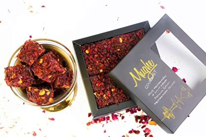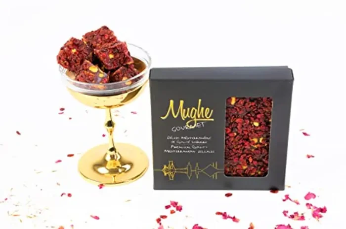 - Mughe Gourmet è una delle prelibatezze turche più tradizionali e riconosciute, Turkish Delight, servita fin dall’epoca ottomana. La nostra delizia turca è realizzata esclusivamente da maestri pasticceri di talento utilizzando metodi tradizionali e combina frutta fresca e noci, senza conservanti o additivi. Idealmente servita dopo i pasti o con il caffè, questa prelibatezza rappresenta perfettamente l’ospitalità turca.