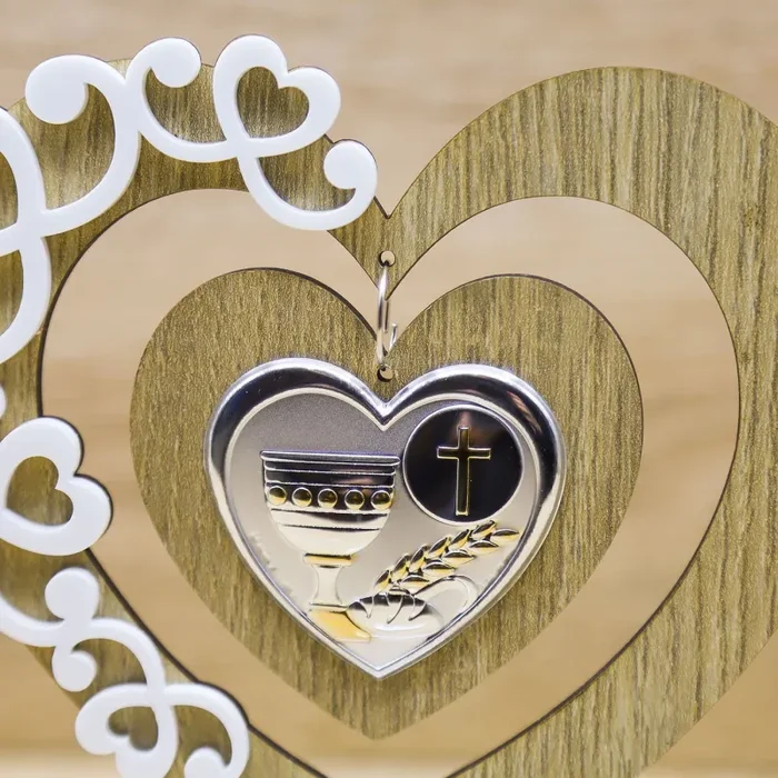 Icona Media in legno a forma di Cuore con applicazione Simboli Comunione placcata argento, firmato Debora Carlucci.