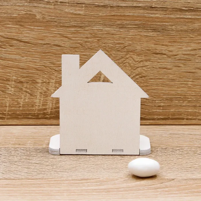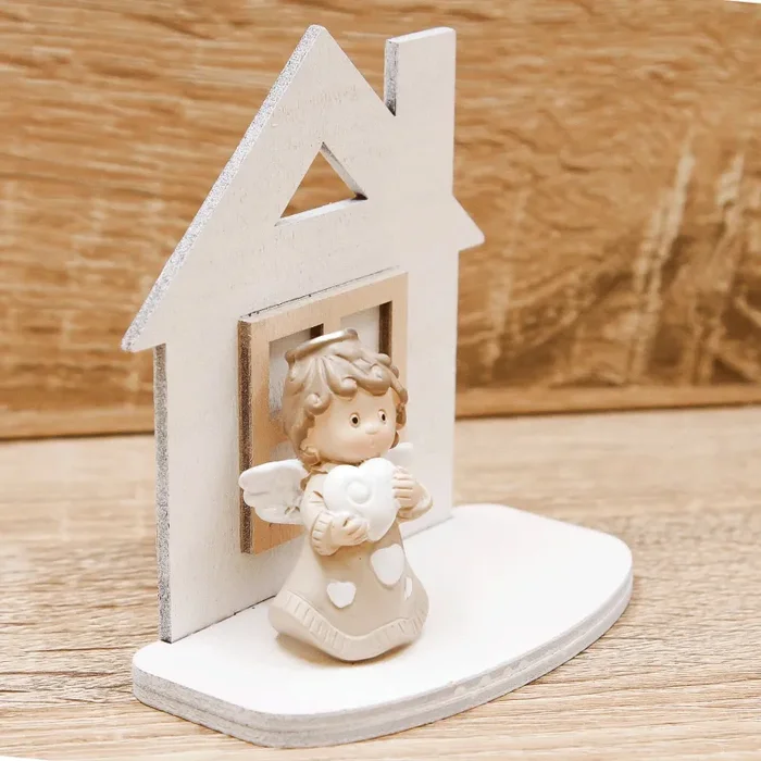 Angelo in resina con Cuore bianco tra le mani, vestito decorato con cuoricini e sul capo un’aureola color argento. Struttura della casa in legno.
