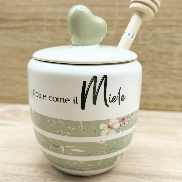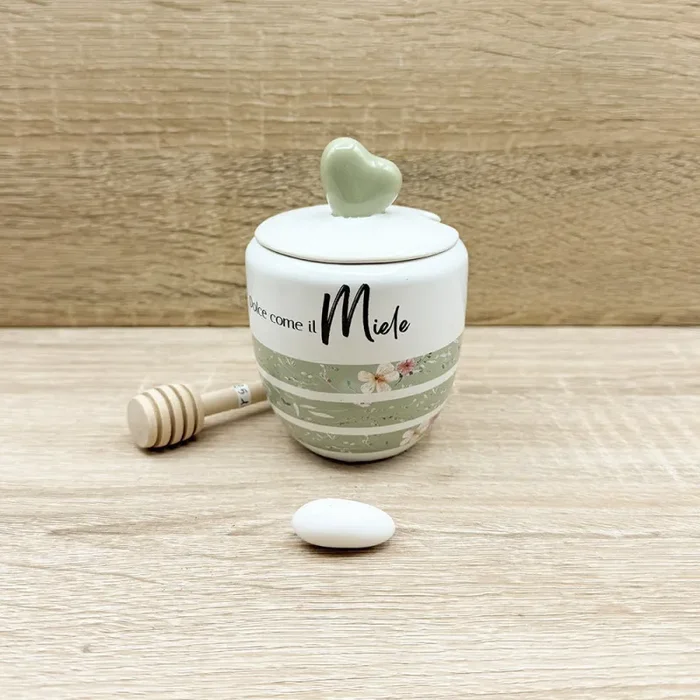 Bomboniera Utile, portamiele con decorazioni floreali dai colori verdi con scritta : ” Dolce come il Miele”, firmato Claraluna.