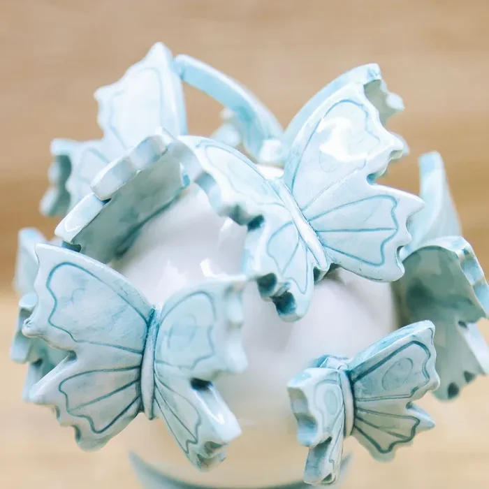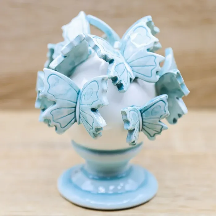 Profumatore tondo con applicazione di Farfalle di colore Celeste, in Porcellana di Capodimonte, firmato Pienne Design.