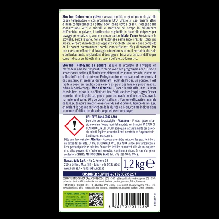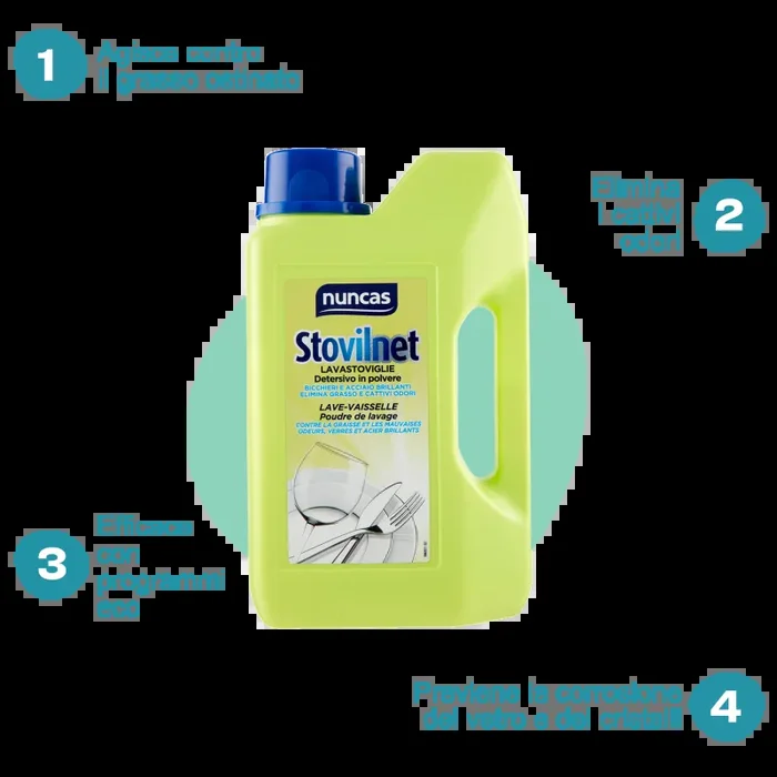Nuncas Stovilnet Detersivo in polvere Lavastoviglie per lavastoviglie è studiato per lavare a fondo le tue stoviglie e per garantirne una completa igienizzazione. È completamente efficace già a 45 gradi eliminando ogni traccia di unto, di grasso e debellando i cattivi odori da piatti e posate.