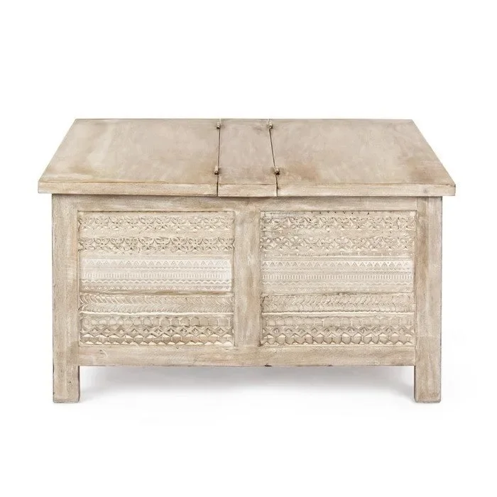 Tavolino con contenitore in legno shabby – Mayra Tavolino con contenitore modello Mayra, dimensioni: 80 x 80 x h. 45 cm. Legno di mango con decorazioni intarsiate a mano e piano apribile. finitura a base di nitrocellulosa.